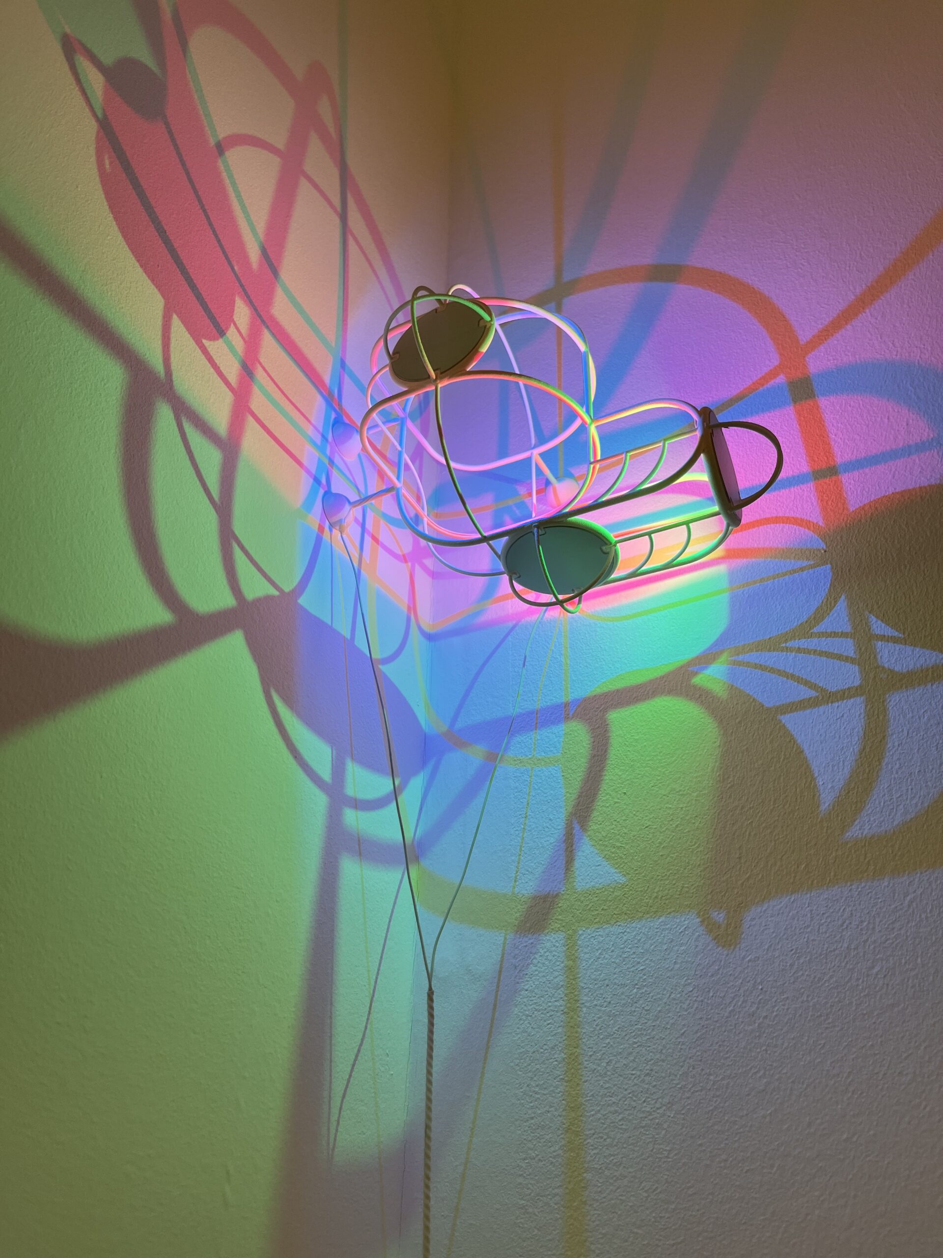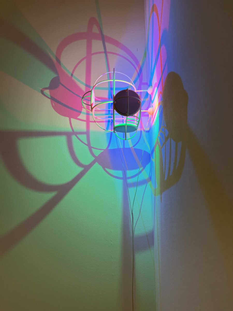 Auf den X Y und Z Achsen wird je eine Rote, Grüne und Blaue LED platziert. Diese leuchten durch ein einigermassen kompliziertes Gitter and die Wand, wo dadurch im jeweiligen eine Farbe fehlt…